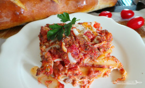 In a large baking dish (larger than a 9 X 13 if you have it) begin layering your Three Cheese Pasta Bake starting with a thin layer of sauce, followed by one-half of your noodles, one-half of all cheese and one-half of your sauce. Repeat the process.
